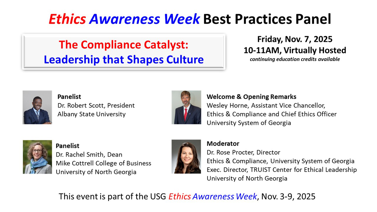 The University System of Georgia (USG) is hosting Ethics Awareness Week Nov. 3-9, 2025. The second event, Ethics and Compliance Panel Discussion, will feature Dr. Robert Scott, president of Albany State University, and other leadership representatives. The discussion will focus on “The Compliance Catalyst: Leadership that Shapes Culture."