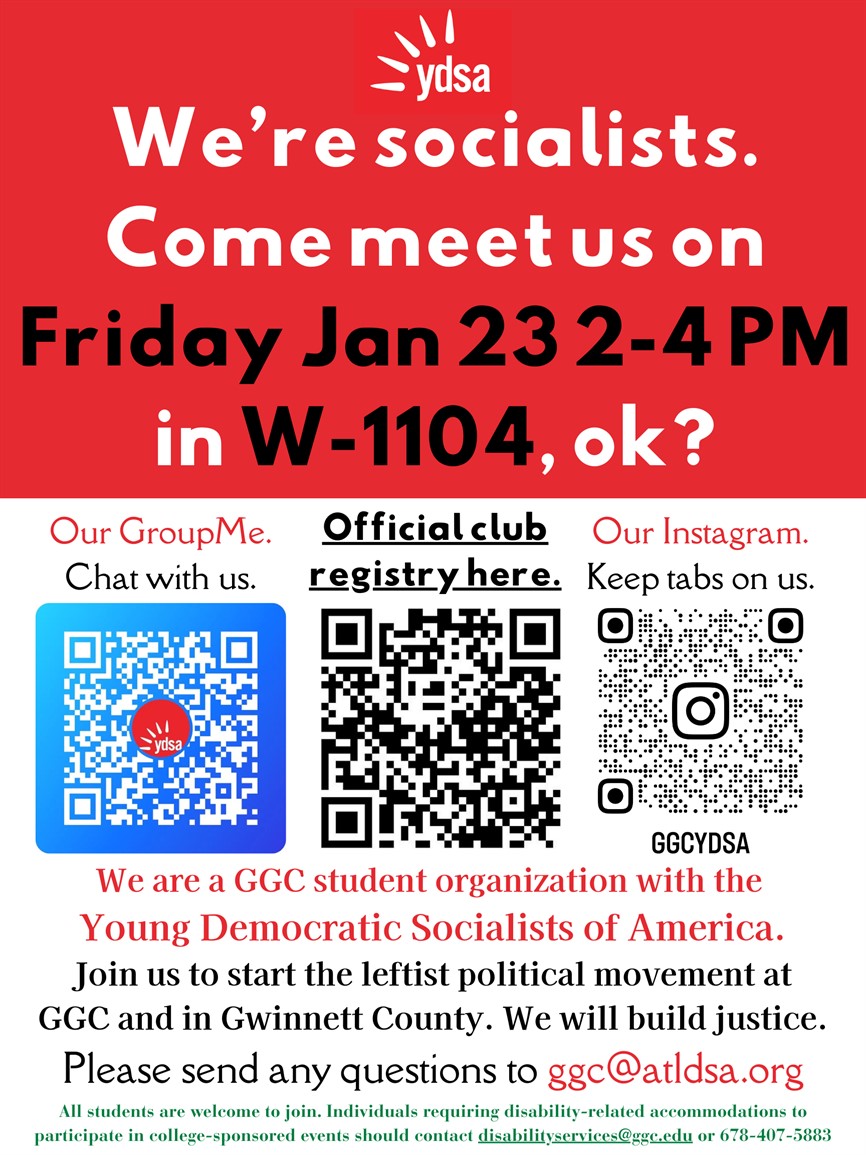 GGC YDSA Kickoff General Meeting Date & Time Fri, January 23 2026 (2:00 PM - 4:00 PM) Location Building W, 1104 Add to calendar Georgia Gwinnett College's (GGC) Young Democratic Socialists of America RSO will have its first meeting! Join us if you are interested in forming a community of leftists at our GGC campus.