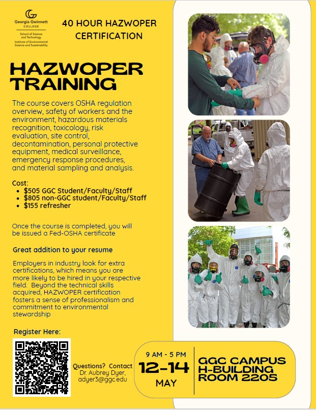 HAZWOPER Training Date & Time Tue, May 12 2026 (9:00 AM - 5:00 PM) Location Building H, 2205 Add to calendar Hazardous Waste Operations and Emergency Response (HAZWOPER) Training. Get certified in the proper protocols and safety measures for dealing with hazardous materials, including in environmental crises!
