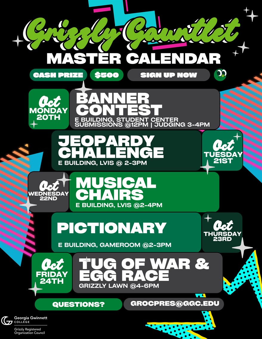 The Grizzly Gauntlet is a friendly competition between RSOs that celebrates participation, talent and school spirit throughout Homecoming Week. Represent your organization in fun team-building activities like Jeopardy, musical chairs, tug of war and more!