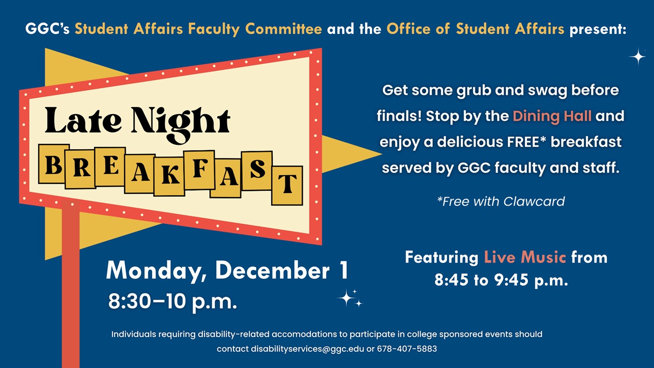 Late-Night Breakfast Date & Time Mon, December 1 2025 (8:30 PM - 10:00 PM) Add to calendar Join us for some grub and swag before finals! Stop by the Dining Hall and enjoy a delicious free (with Claw Card) breakfast served by your favorite GGC faculty and staff.