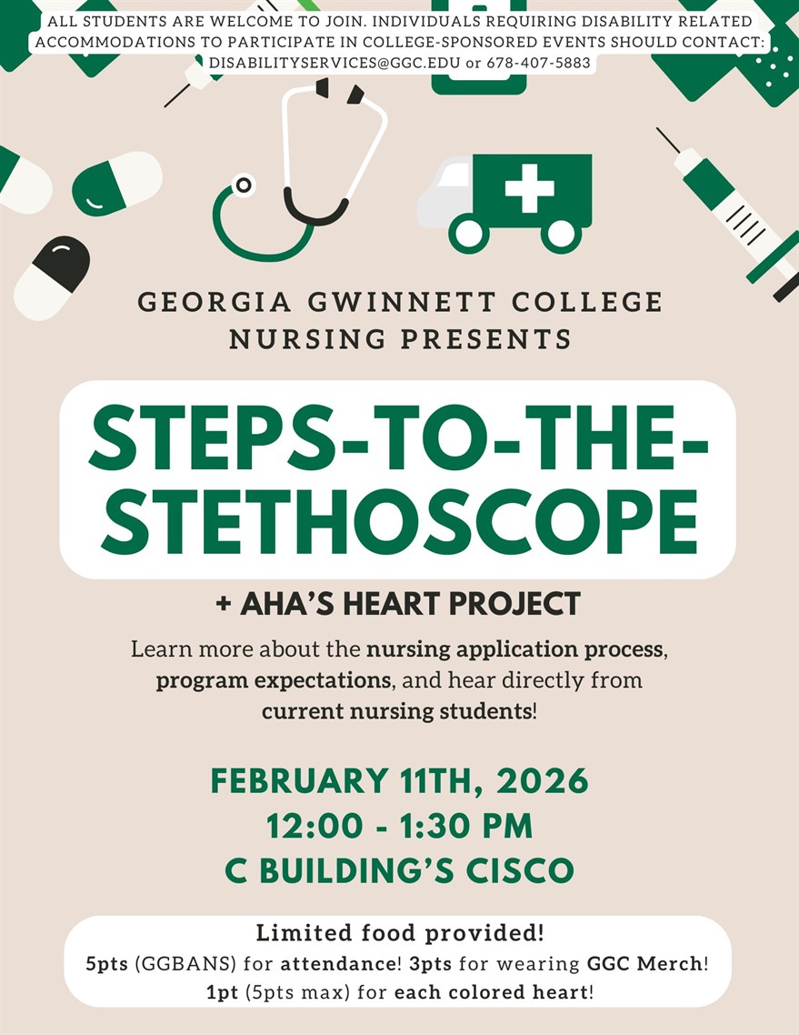 Steps to the Stethoscope is an interactive, informational event designed for pre-nursing students and anyone interested in applying to the GCC Nursing Program. Attendees will learn about what the nursing program is like, how to prepare for admission, the application process, and opportunities to get involved through leadership and student organizations. The event will also include a Q&A session with current nursing students, giving attendees the chance to ask real questions and gain firsthand insight. Food will be provided.