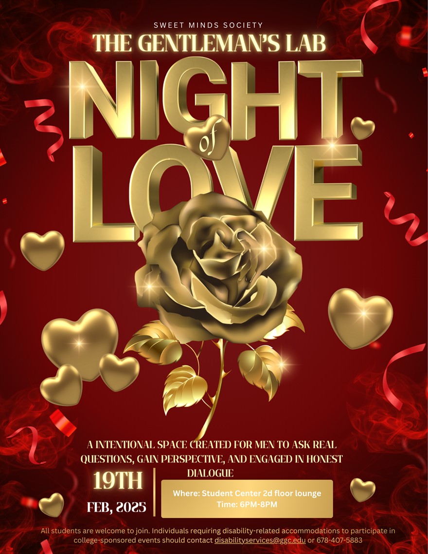 The Gentleman's Lab: Night of Love Date & Time Thu, February 19 2026 (6:00 PM - 8:30 PM) Location Building E Second Floor Lounge Add to calendar Join the Sweet Minds Society for a night focused on men's mental health! Ask real questions, gain perspective and engage in honest dialogue alongside other students.