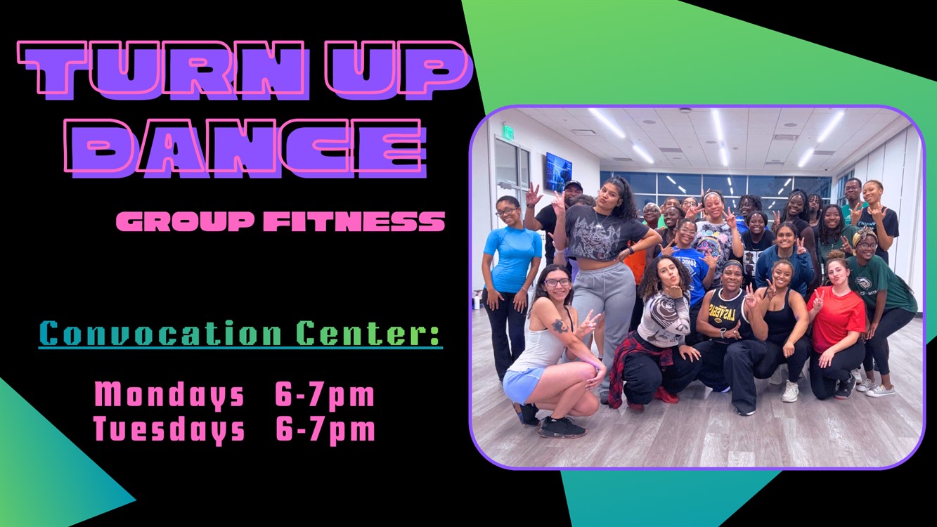 Turn Up Dance Fitness GF Date & Time Mon, February 2 2026 (6:00 PM - 7:00 PM) Location Convocation Center, 1300 Add to calendar Bold moves, big energy and a serious calorie burn. Open to all levels!